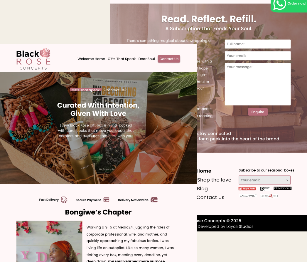 Black Rose Concepts is a Cape Town based curated gifting business that needed a fresh, elevated online presence. I took her website through a full revamp, transforming it into a clean, modern, and user-friendly showcase of her products. Beyond design, we continue to manage the site and craft blog content that strengthens her voice, boosts SEO, and connects with her audience. This project reflects Layali Studios’ ongoing partnership approach and helping brands grow, not just launch.